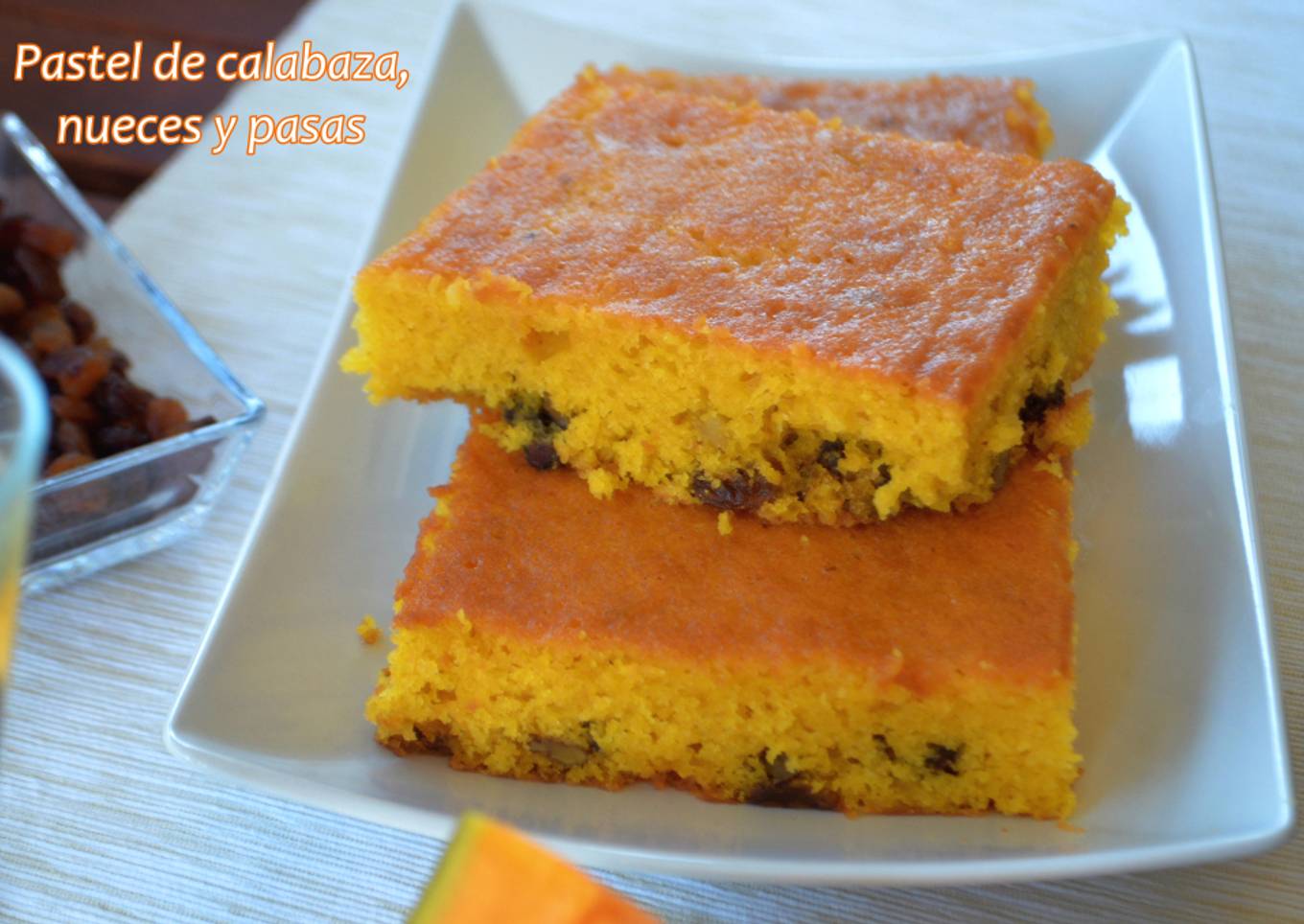 Buenas !! hoy os dejo una tarta de calabaza de las que repites !!. Es una tarta muy jugosa y de un delicado sabor. Las pasas y las nueces hacen un contraste muy rico con el sabor de la calabaza. Nunca pensé que las hortalizas dieran tanto juego a la hora de hacer repostería.