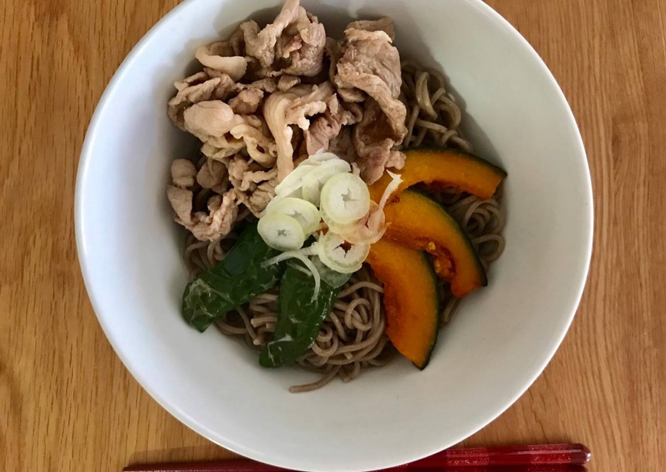 - Poner la soba, los pimientos verdes, las calabazas y la carne. Se puede decolar con un poco de negi si le guste. ¡Listo!