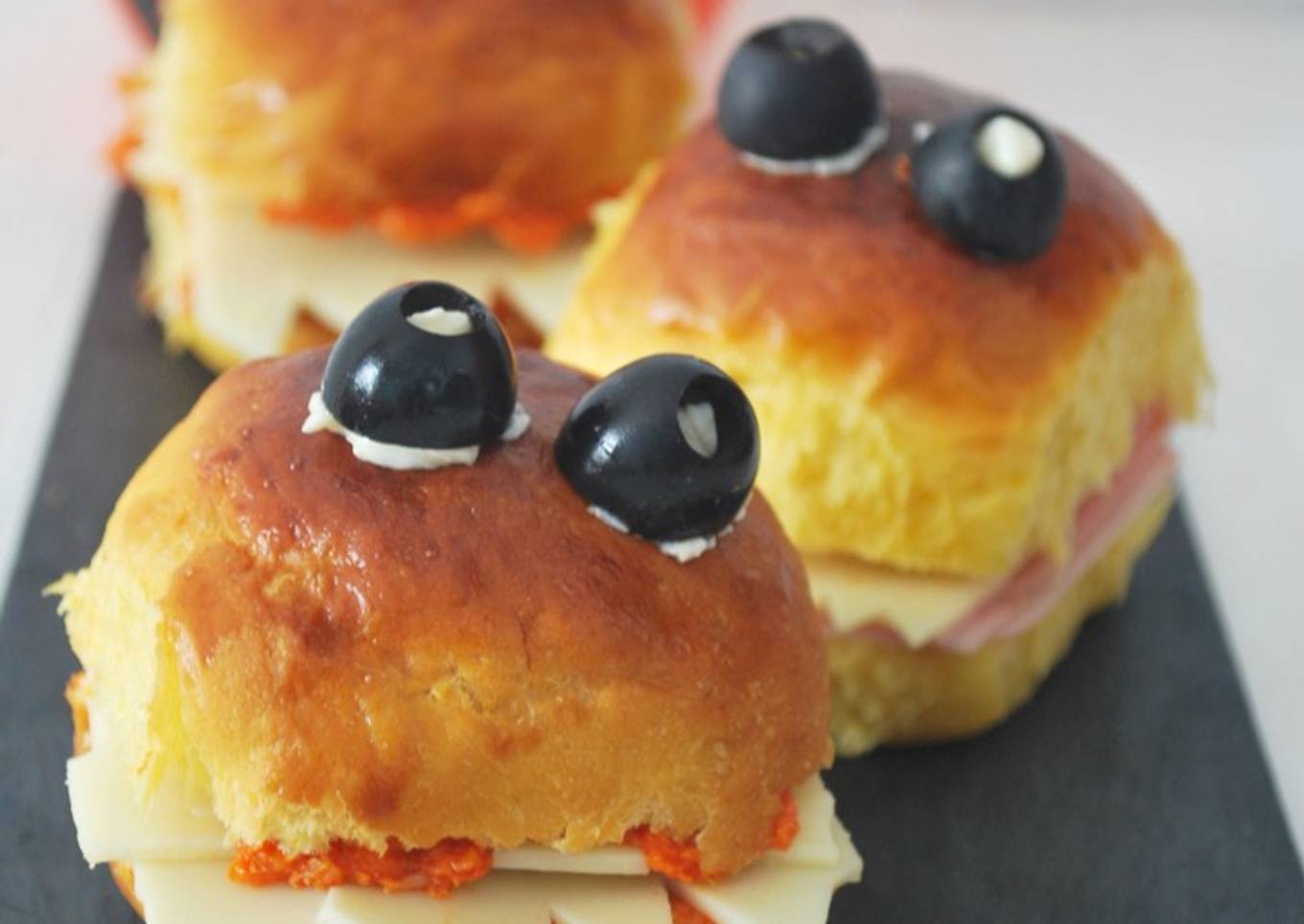 - Corta aceitunas negras para hacer los ojos y pega a los panecillos con quesito o queso crema.