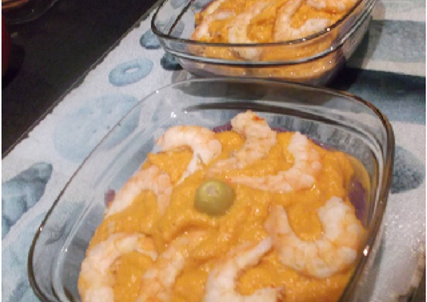 En esta ocasión os mezclo dos cremitas, una de lombarda y otra cremita de calabaza con zanahoria, de colofón decoramos con unas gambitas saladas.