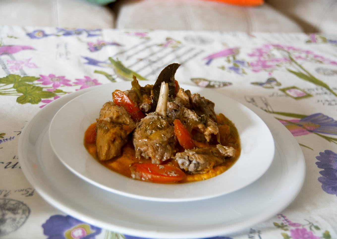 - Partir del pollo: los contra muslos partidos por la mitad, el muslo como una nuez (chupachup) y las pechugas a trozos grandes. Ponerlos en una cazuela donde quepa gusto añadir las verduras troceadas uniformemente con un chorretón de aceite, la salsa de pollo reducida, la hoja de laurel el tomillo, romero, sal y pimienta molida. Cuando empiece hervir cocer durante diez minutos a fuego fuerte y reducir el fuego al mínimo y guisando 50 minutos más sin que deje de hervir (pequeños borbotones).