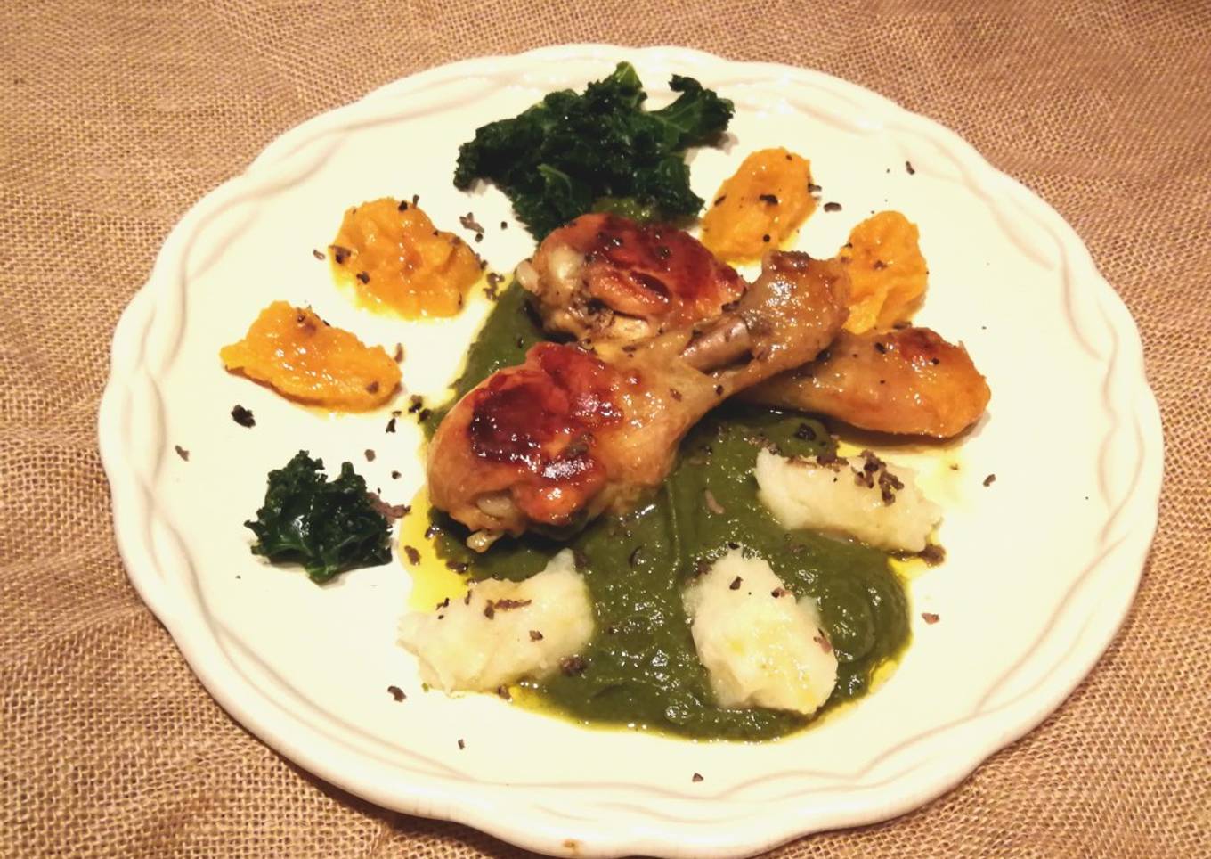 Jamoncitos de pollo sobre puré de col kale y trufa