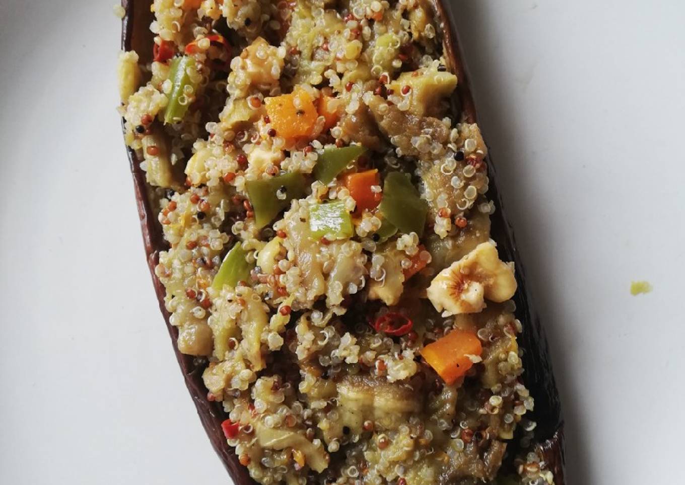 Berenjena rellena de Quinoas y verdura salteada