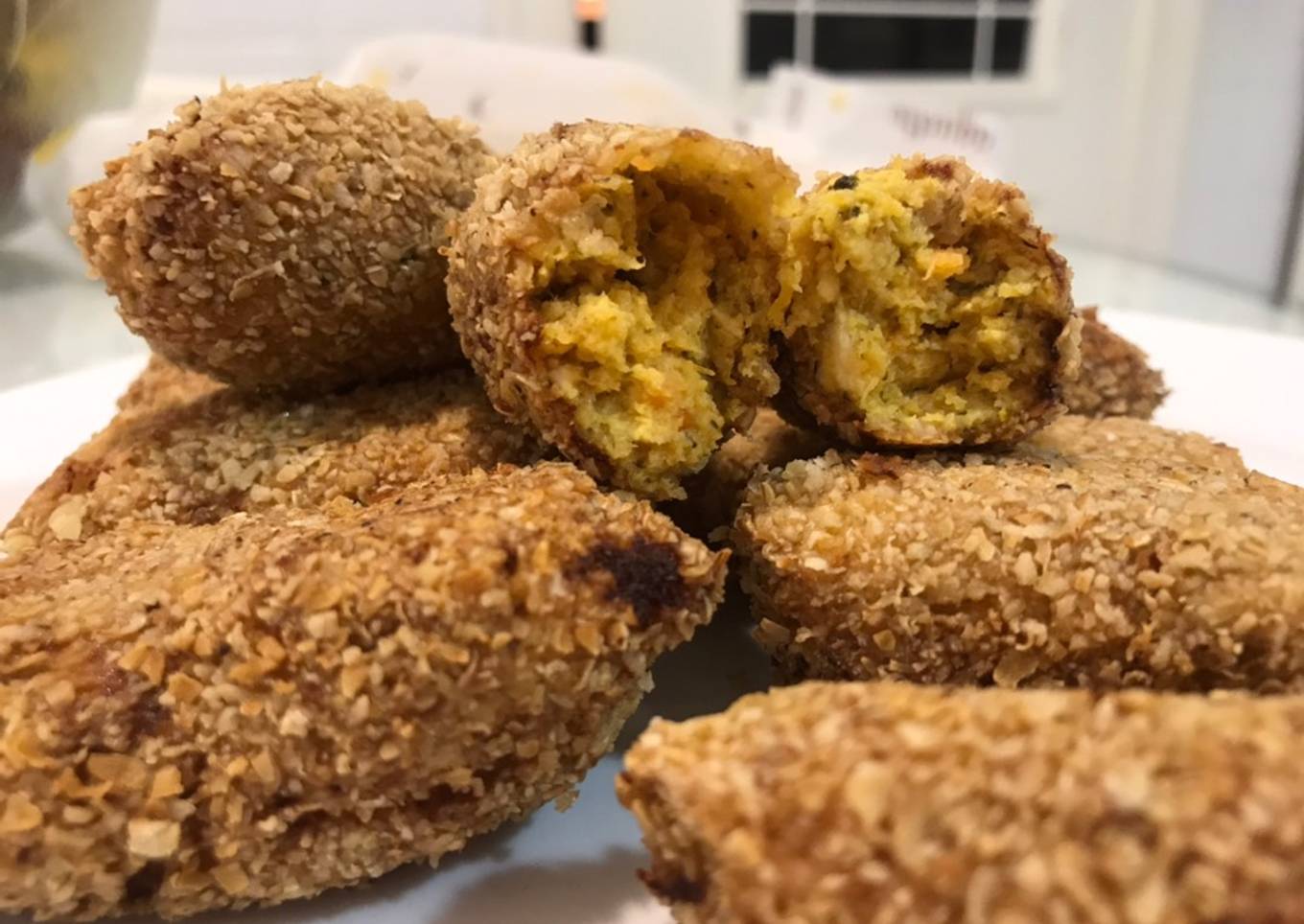 - Hacer con 2 cucharadas la forma de las croquetas, pasar por el plato de huevo y finalmente por el de copos de avena.