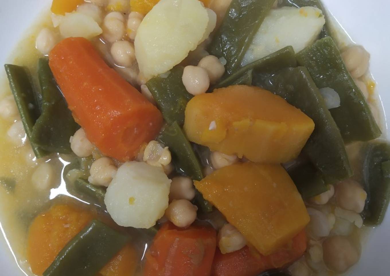 - Lo que quedan son los garbanzos con algo de caldo a los que se le añade, todo partido, la patata, la zanahoria, la calabaza y las judías verdes.